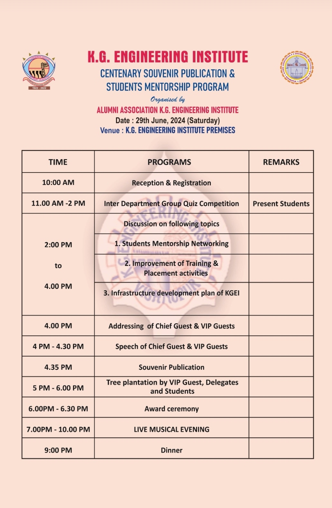 - Facilitate overall development of KGEI including infrastructure development by way of providing support from Alumni Community .