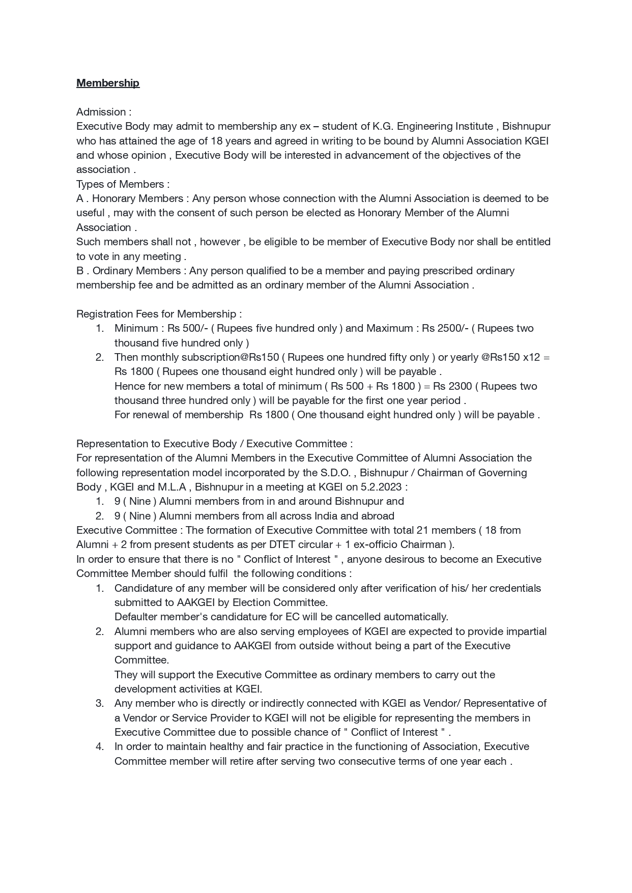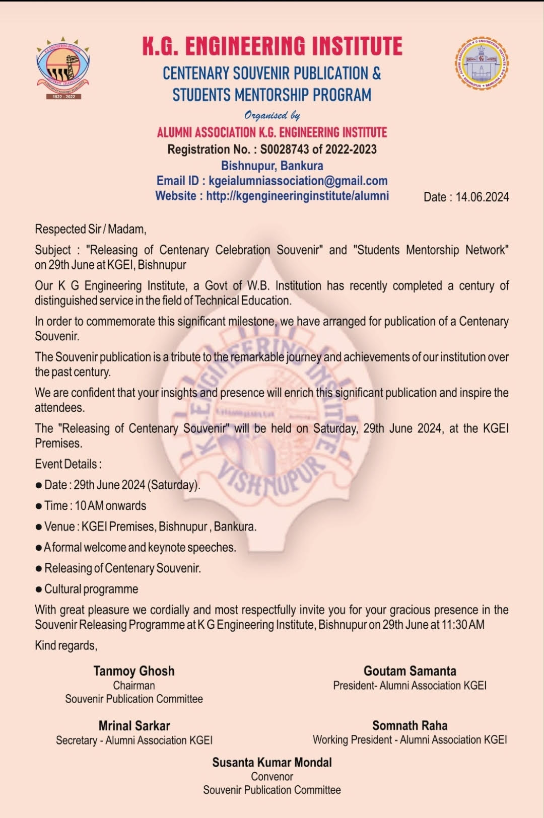 The Alumni Association of KG Engineering Institute is formed in July , 2022 in compliance with the Order no. 214 – TET dt 22.3.2022 , Director of Technical Education & Training , Govt of W.B. at KGEI , Bishnupur , W.B.